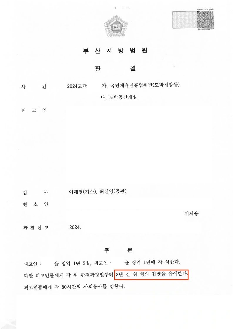 불법 도박 범죄에 대한 경고와 동시에 재범 방지를 전제로 한 처벌로 사건이 종결되었습니다.