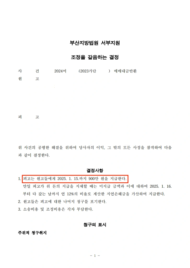 아파트 누수를 이유로 매매대금 전액 반환(4억 4,500만 원)을 청구한 사건에서 피고를 대리하여 조정을 갈음하는 결정으로 900만 원 지급에 그친 사례