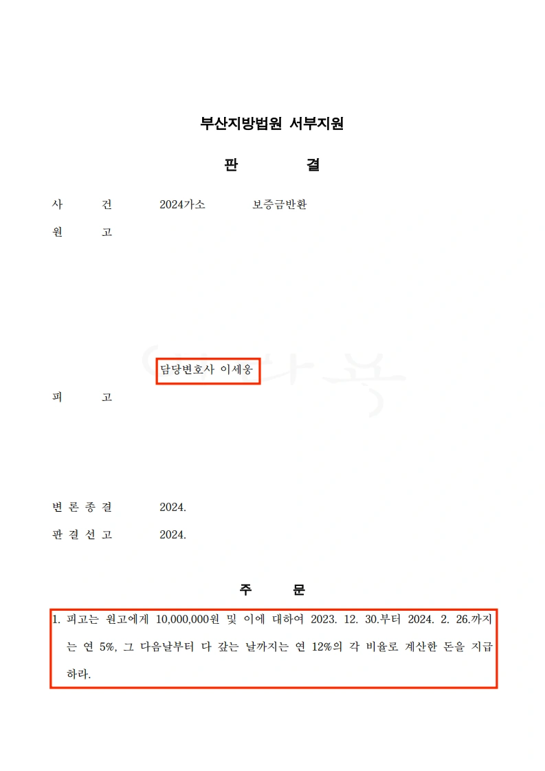 임대차 종료 후 보증금 일부 반환 거부 사안에서 청구금액 1,000만 원 전부를 인용받은 전부승소 사건