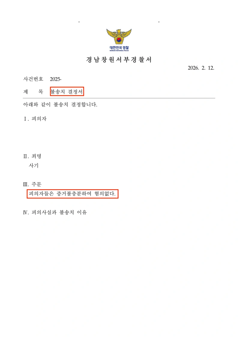 고 판단하여 혐의없음(증거불충분) 불송치결정을 하였습니다.