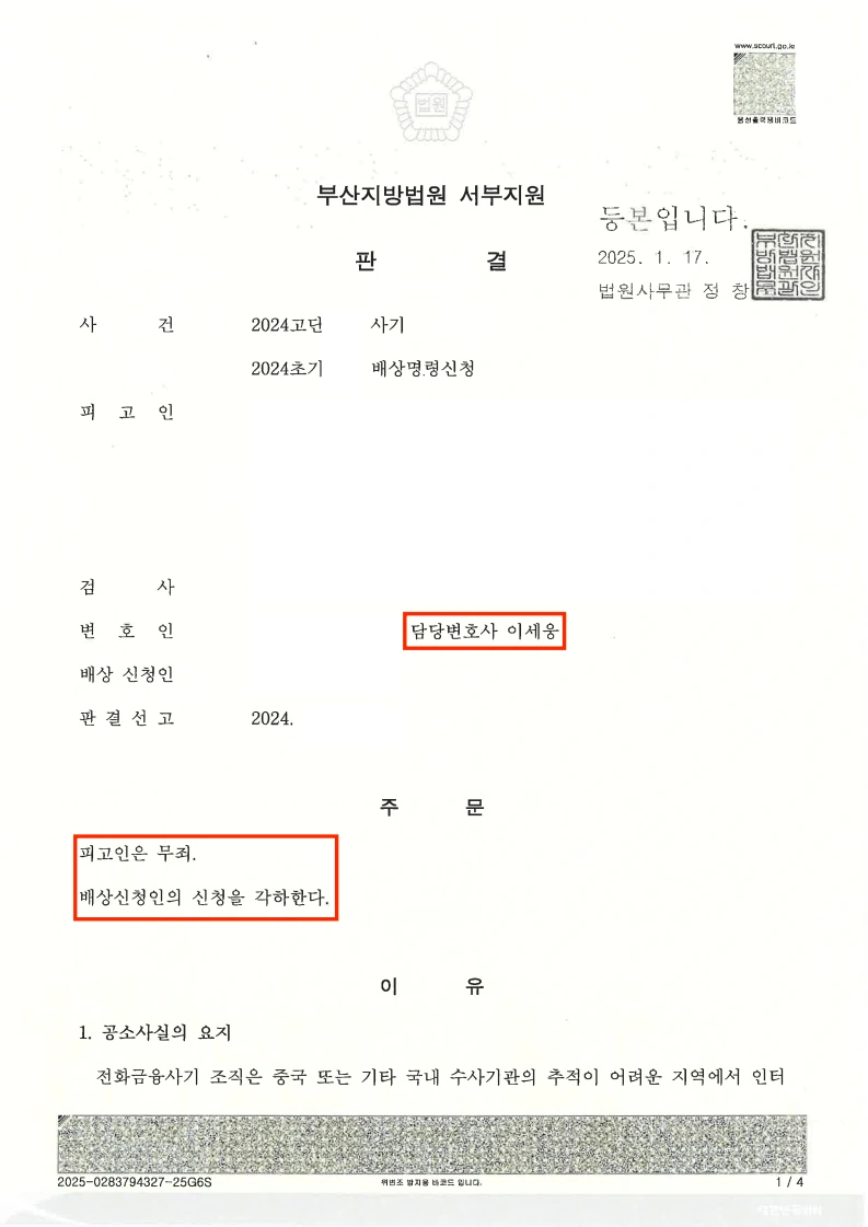 보이스피싱 현금수거책 사건에서 1심 무죄 및 검사 항소기각으로 최종 무죄 확정된 사례